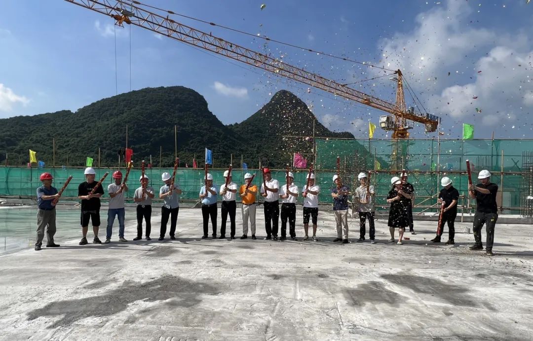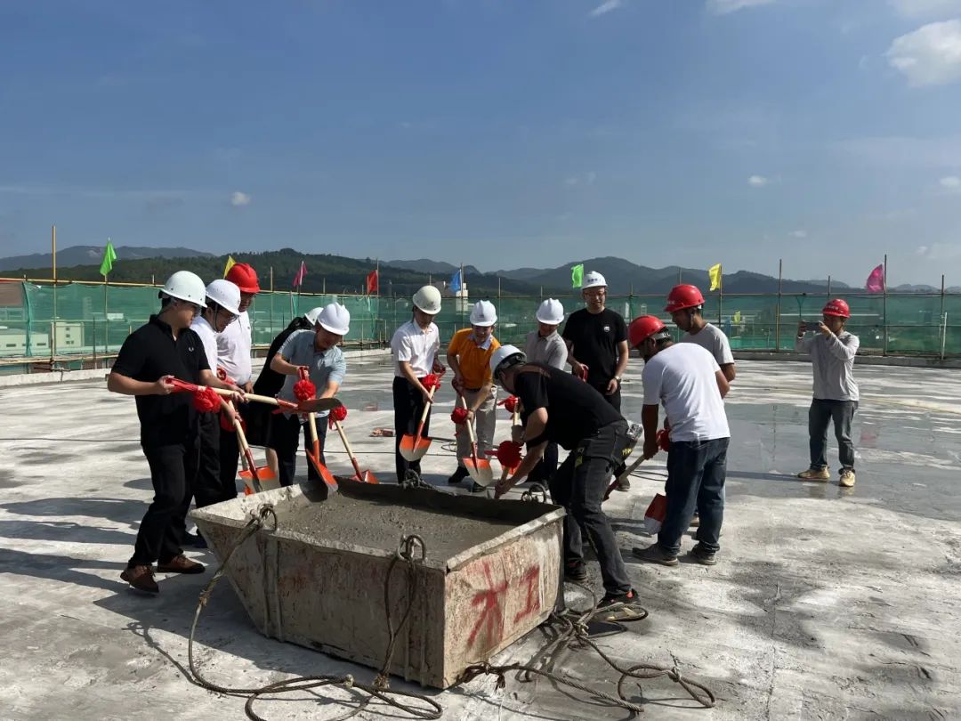 韶关高新区管委会相关人员与项目方人员共同挥铲最后一斗混凝土。