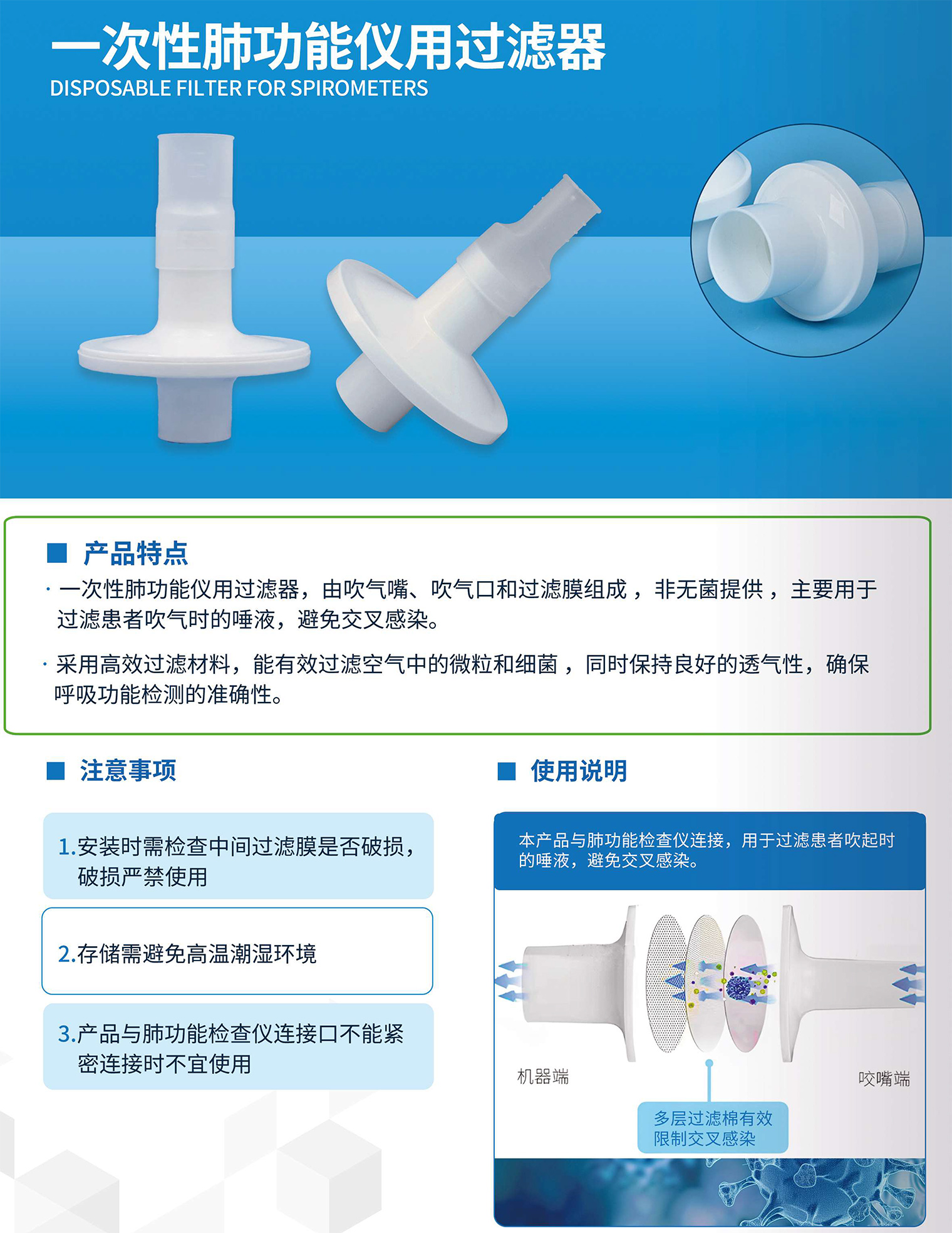 感染控制:阻隔患者呼出的病原体(如细菌、病毒、结核杆菌等),避免污染肺功能仪传感器或传播给他人。